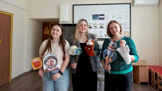 Профессор Знайкин и маленький щеночек перенесли зрителей в космическую лабораторию, где герои совершали невероятные приключения и открывали новые планеты. Дети с интересом наблюдали за действиями, активно принимали участие в спектакле.