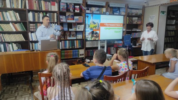 В рамках проекта «Путешествие в средневековый Крым» в детской библиотеке-филиале №5 состоялась встреча с председателем культрно-просветительного общества «Херсонес» Кацы Дмитрием Лазаревичем и членом греческого общества Котковой Ириной Анатольевной.